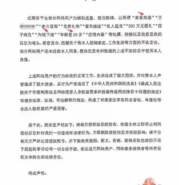 当年的其中一个美女主持张蕾就经历过这样的恶劣事件,上面的标签她全都被戴过,甚至还上升到张蕾孩子身上,这才是最过分的。被逼无奈的张蕾只能出面澄清,发布了一条长文,为了表示真实性,发的还是带了手印的声明。